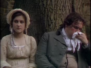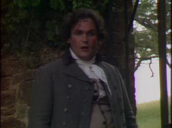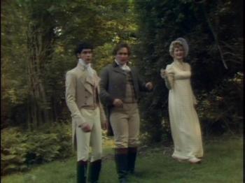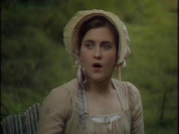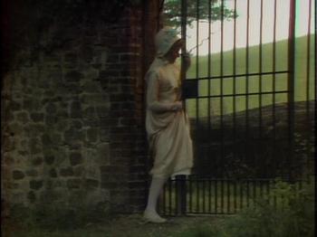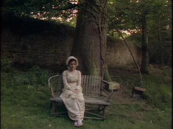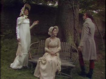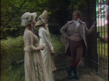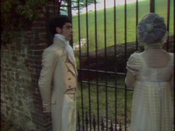 Because of time restraints, I will not attempt to critique the entire movie but focus on one favourite scene which I will call the ‘Sentinel at the garden gate’ from episode 2. Fanny Price and her cousins Maria, Julia and Edmund Bertram travel with Mary and Henry Crawford to the grand Elizabethan era estate of Sotherton Court to visit Maria’s fiancé Mr. Rushworth. As the couples walk through the wilderness parkland adjacent to the estate, director David Giles reveals Austen’s comedic genius in a scene that could have inspired any vintage vaudeville burlesque or modern television sitcom. When Fanny becomes fatigued, she is deposited on a park bench in the shade adjacent to a locked iron gate that has bared progress through the park. As the different groups and individuals arrive in search of each other, Fanny acts as the ‘sentinel of the garden gate’, relaying messages and explaining to everyone who has come and gone, and why. Austen’s brilliant comedic timing is in full play, and the director David Giles knows how to emphasize the right moments to build tension to the point of hilarity.