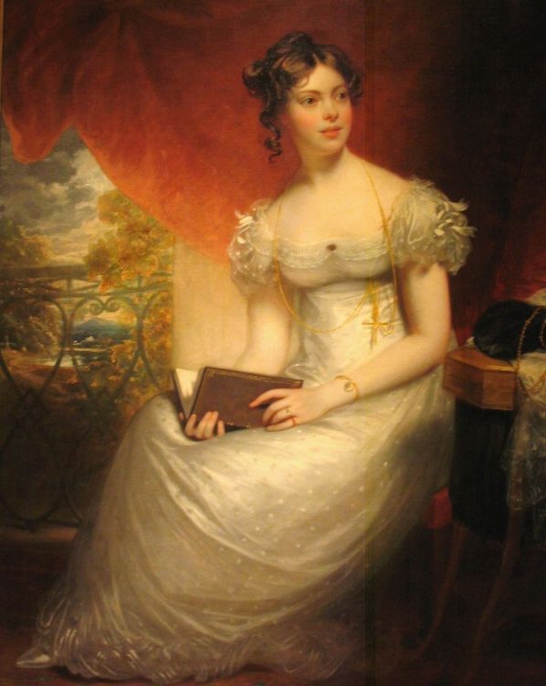 The painting is an example of British portraiture popular during the Regency era. The subject is Kitty Packe, (nee Hort) and was painted by Sir William Beechey (1753-1839) circa 1818-1821. Miss Hort married Charles William Packe of Prestwold Hall, Leicestershire in 1823. The painting now resides at the Oklahoma City Art Museum, though according to their website is unfortunately not on view. It is disturbing to think of Miss Georgian tucked away in some storeroom, not worthy of being on view to the public! This painting deserves a prominent position in a grand room in an English manor house. It saddens me to think that England’s national treasures are sold away from their heritage, and then not displayed. Well, now on to happier thoughts.