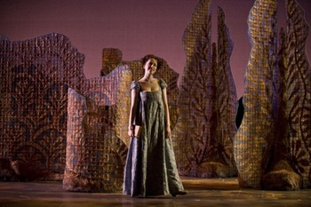The set was elaborate and intricate. A revolving floor dressed with stylized tree-like structures that were moved in and out and around the stage to allow characters to walk through woods and halls and rooms, also facilitated the movement of furniture on and off stage to create lavish sets for Longbourn, Netherfield Park, Rosings, and Pemberley.