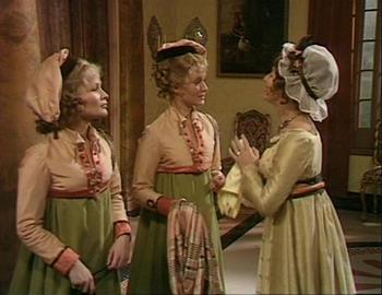 The costumes and hair: pictures can say so much more than I, so take a gander. Beyond the non-period bouffant hairdos for both women and men, the matching pelisses for Elinor and Marianne really made me roar with laughter.