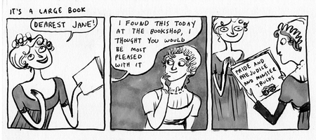 The talented artist Kate Beaton is at it again – doodling hysterical Jane Austen comics for our amusement. She seems to always have a knowing eye and the pulse on the latest Jane in-jokes. Visit her website Hark! A Vagrant and check out the Jane Austen archive. Oh, and happy Sunday. My favorite day of the week because it is my Saturday.