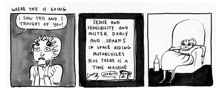 UPDATE: LOL folks. There is actually a short story posted on the Derbyshire Writers’ Guild (DWG) entitled Sense and Sensibility and Mr. Darcy and Sharks in Space Riding Motorcycles Plus There is a Time Machine! Kate must have seen this posted on May 8th and been inspired to create the comic in reaction.