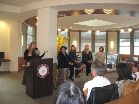 The ladies spoke to an SRO crowd at Leatherby Libraries on campus! Prof. Hall, who is a scholar of 19th Century British literature introduced the four panelist and asked each of them probing questions on how they were introduced to Jane Austen, their road to publication and their reactions to marketing of their works, namely cover designs. Interestingly, each of the panelists has strong ties to Hollywood. Diana Birchall, author of Mrs. Darcy’s Dilemma, is a story analyst for Warner Brothers Studios, Syrie James, author of The Lost Memoirs of Jane Austen, worked as screenwriter for several years before tuning her pen to novels, Laurie Viera Rigler has worked in the industry including turning her popular Confessions of a Jane Austen Addict series into an original web comedy series, Sex and the Austen Girl, and Karen Joy Fowler’s bestselling novel The Jane Austen Book Club was made into a movie in 2007.