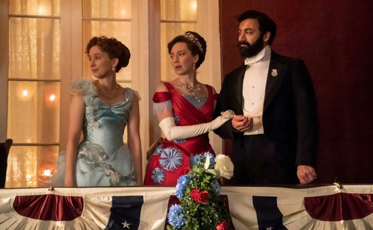 Climbing the social ladder of Old New York society are nouveau riche Gladys Russell (Taissa Farmiga), Bertha Russell (Carrie Coon), & George Russell (Morgan Spector) in The Gilded Age on HBO.