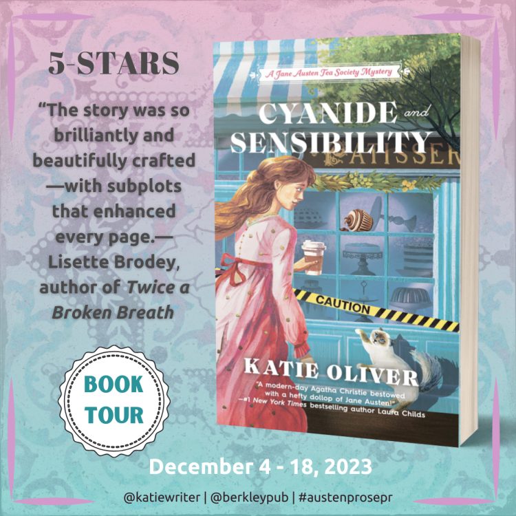 Today I am happy to recommend a new book for your TBR that fits the bill as the perfect cozy mystery, with the added bonus of having a Jane Austen twist. Cyanide and Sensibility is the third novel in Katie Oliver’s A Jane Austen Tea Society Mystery series with modern-day characters inspired by Austen’s Sense and Sensibility.